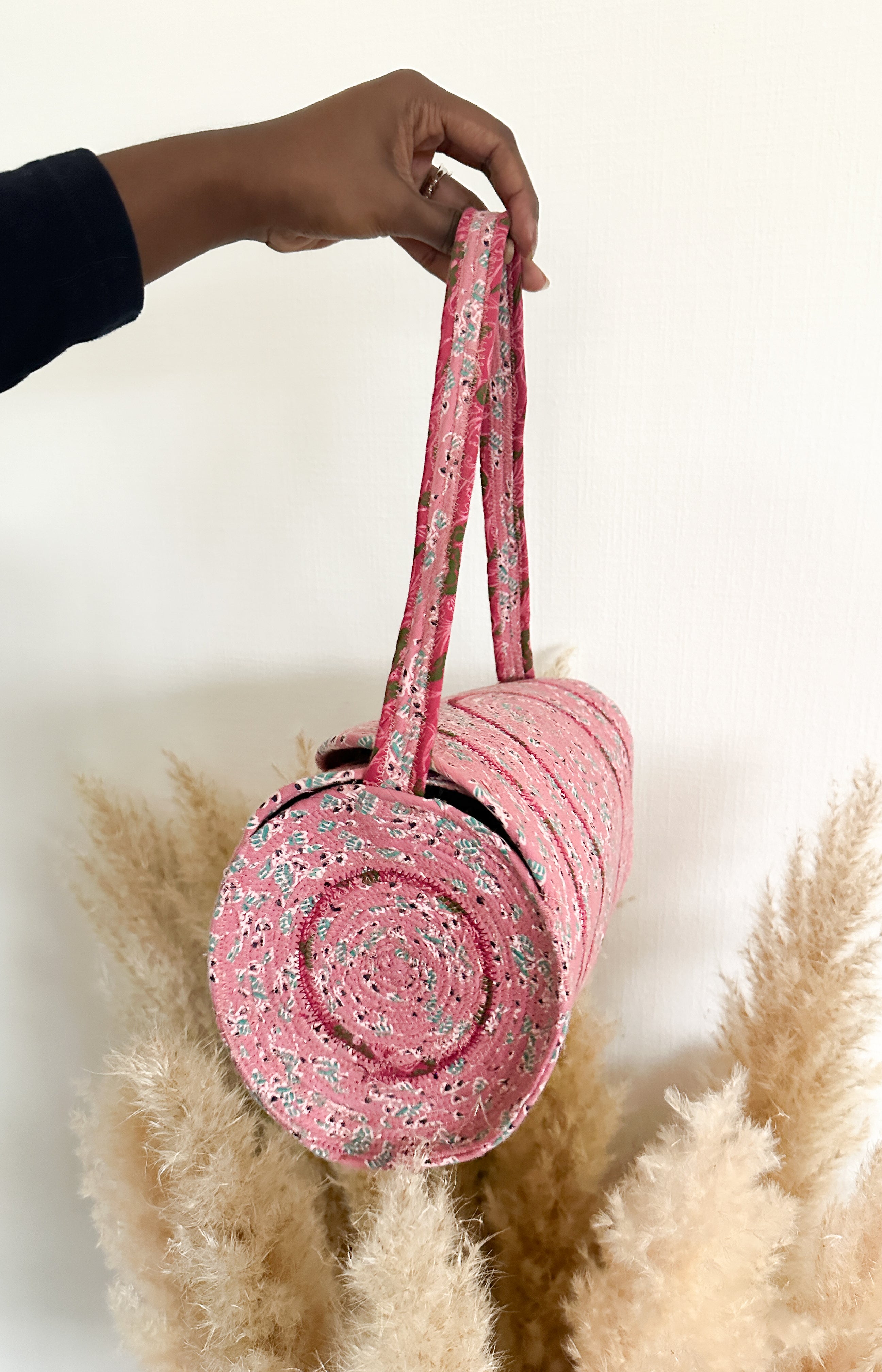 Each of our bags is beautifully handcrafted by skilled female artisans in India, using only natural materials. The interior is made from jute—a durable, sustainable plant fiber widely grown across India and readily available in local markets. The jute is layered with upcycled cotton fabric, sourced from nearby fashion factories, making these bags an eco-conscious blend of new and repurposed materials.