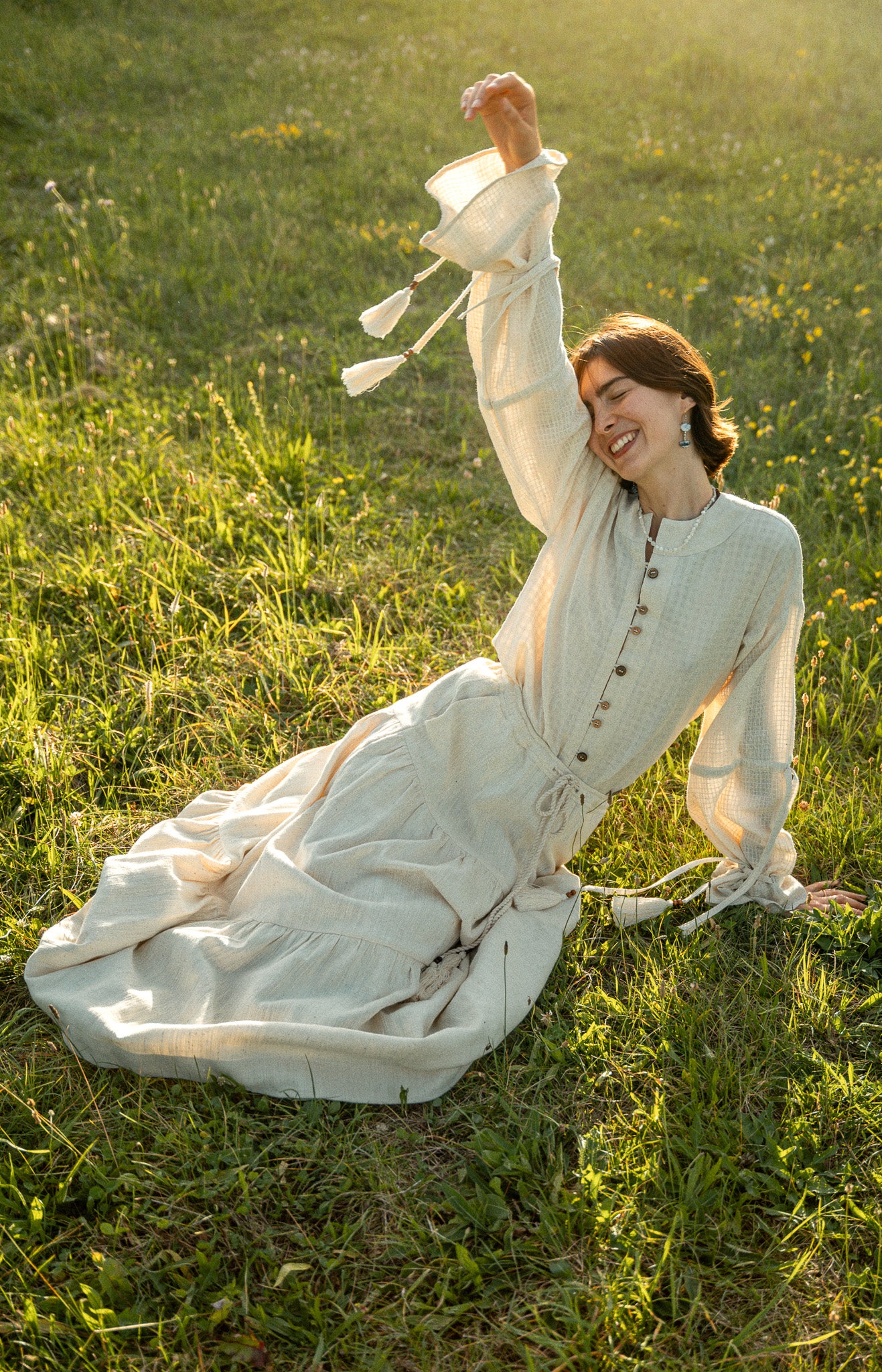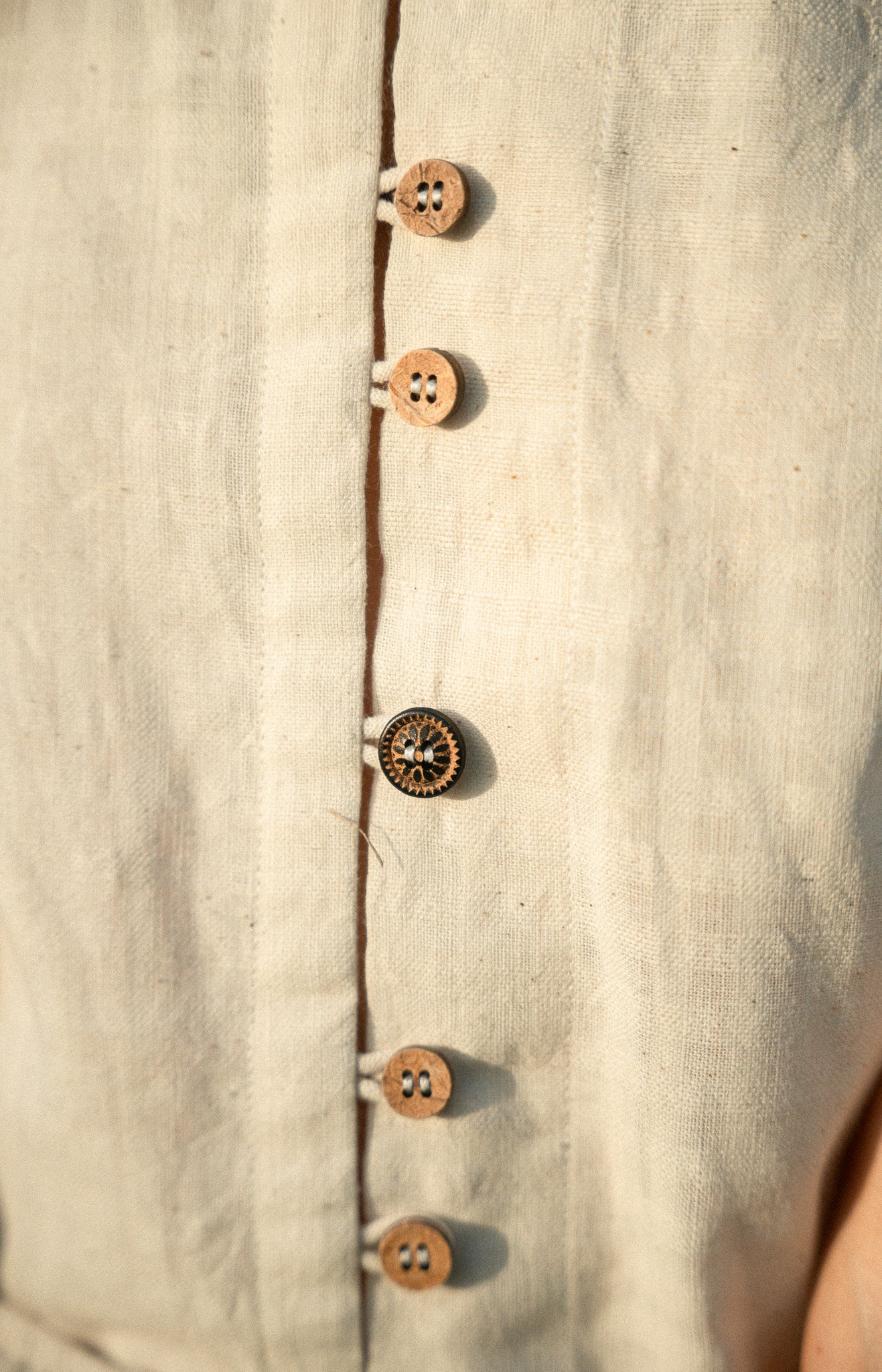 The sleeves are functional so one can wear the blouse either as a more romantic style or one can hang it loose for a more relaxed feeling. These ties ensure a perfect fit. Sleeves entail handcrafted coconut beads and tassels to provide a unique look. The front part is embellished with handmade coconut buttons from Kerala, India.
