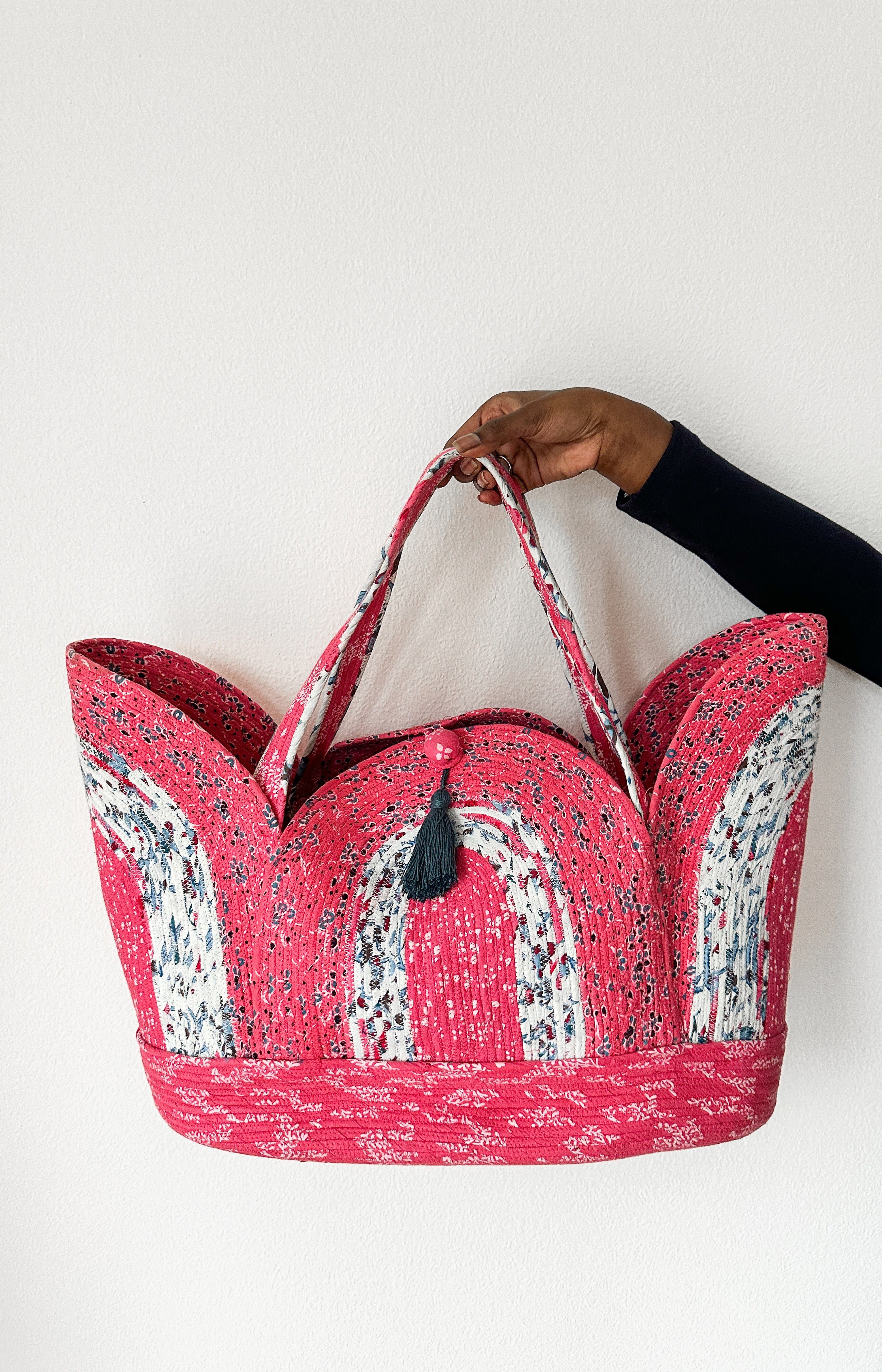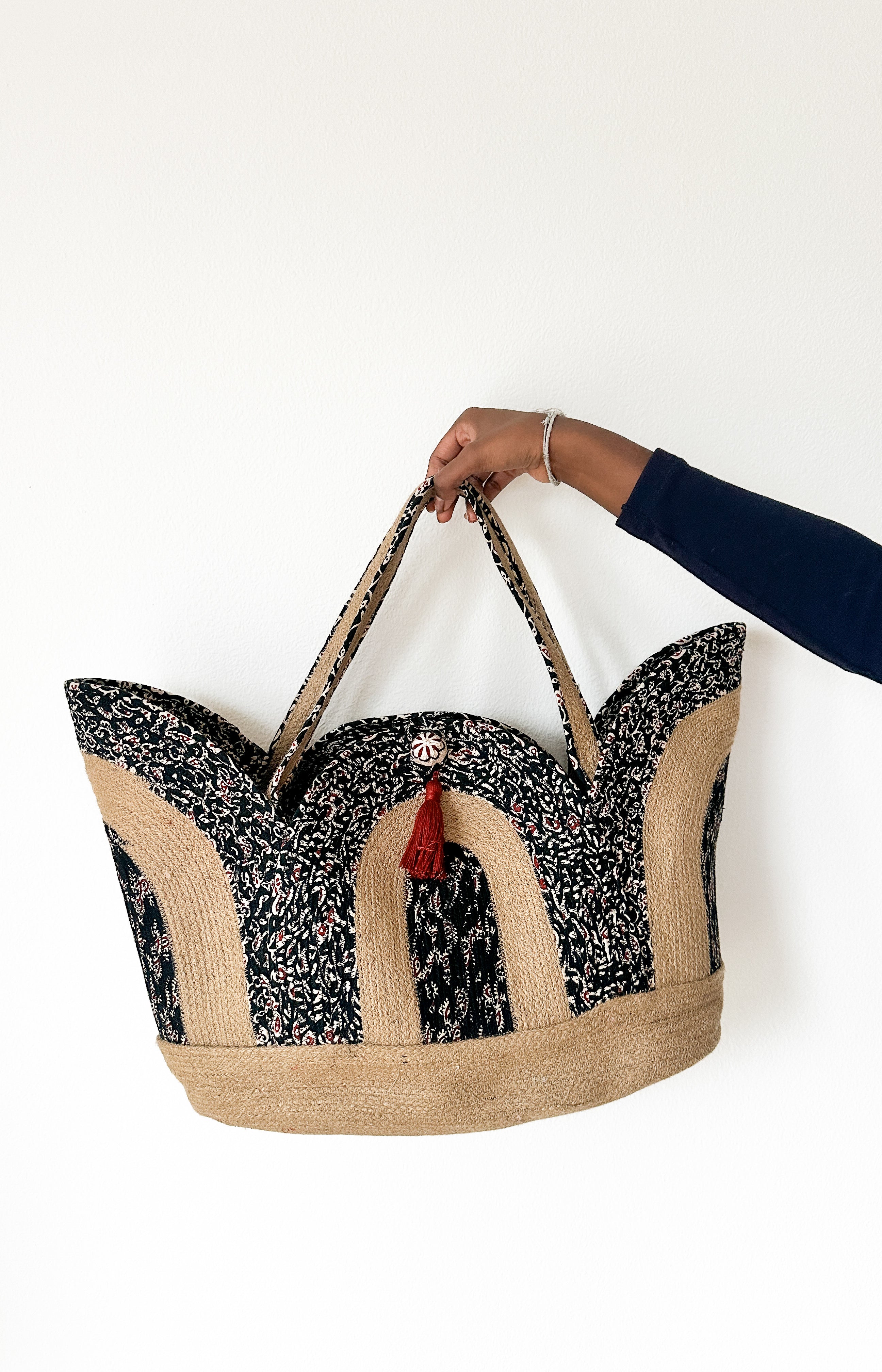 Each of our bags is beautifully handcrafted by skilled female artisans in India, using only natural materials. The interior is made from jute—a durable, sustainable plant fiber widely grown across India and readily available in local markets. The jute is layered with upcycled cotton fabric, sourced from nearby fashion factories, making these bags an eco-conscious blend of new and repurposed materials.