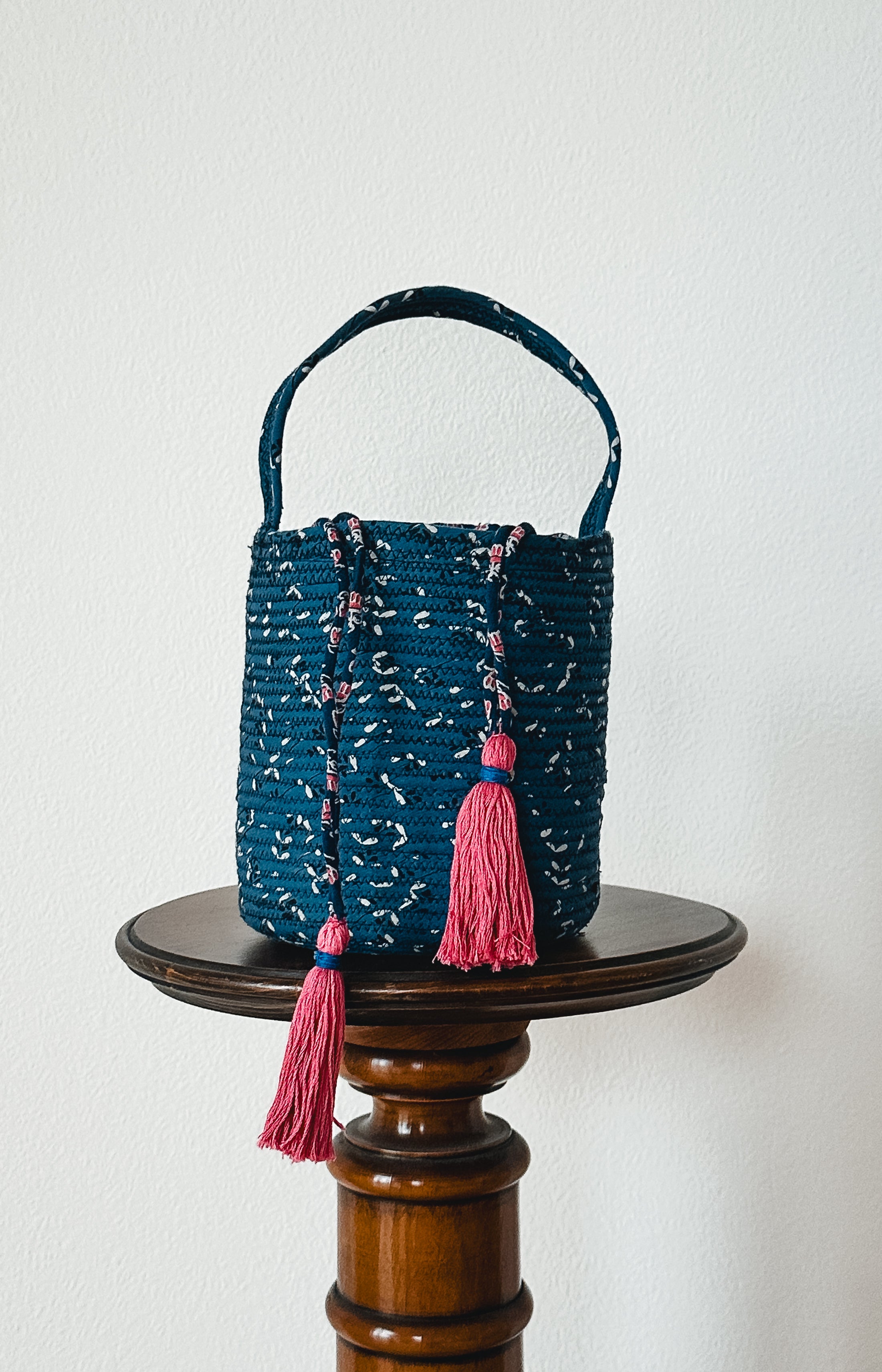 Each of our bags is beautifully handcrafted by skilled female artisans in India, using only natural materials. The interior is made from jute—a durable, sustainable plant fiber widely grown across India and readily available in local markets. The jute is layered with upcycled cotton fabric, sourced from nearby fashion factories, making these bags an eco-conscious blend of new and repurposed materials.